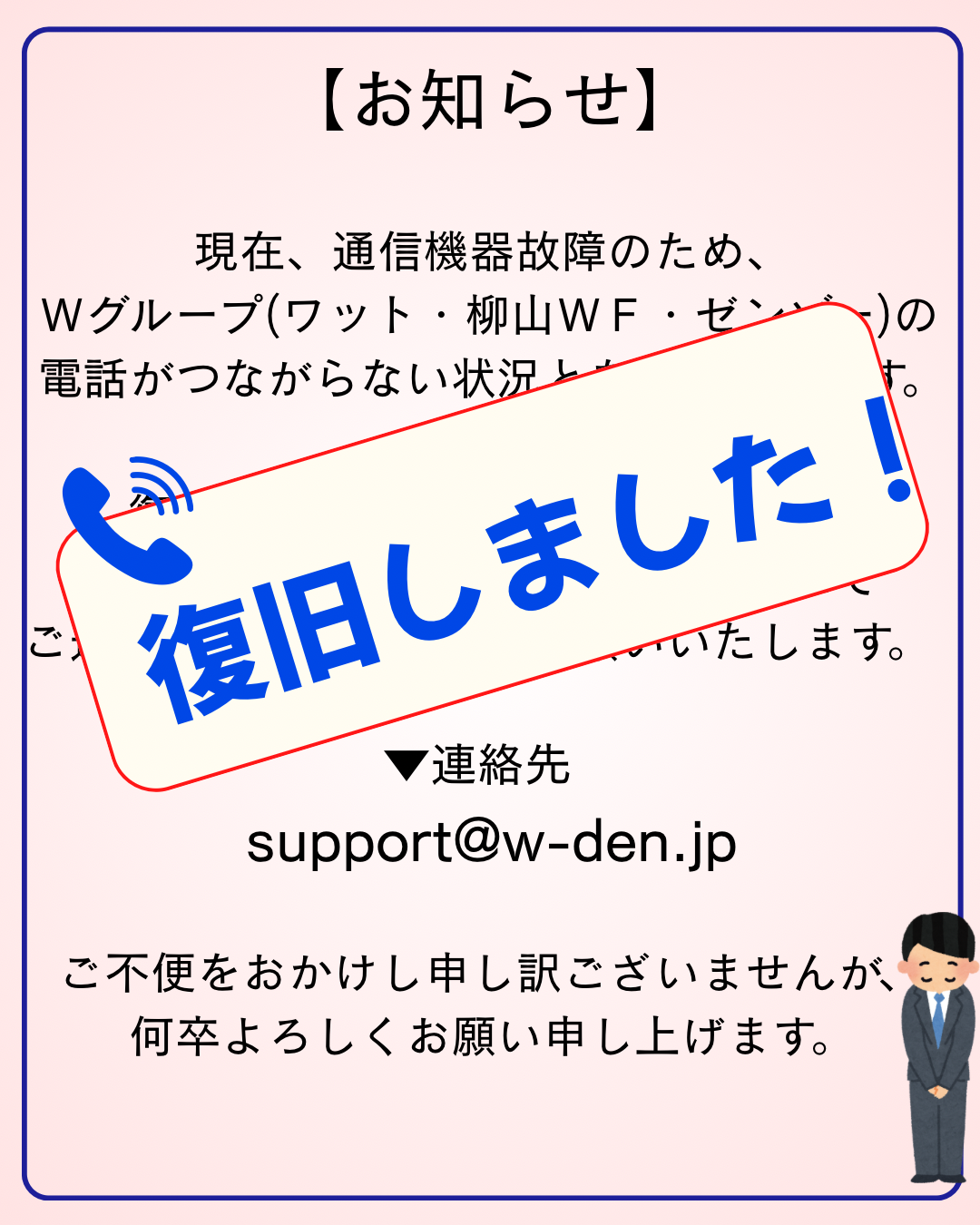 現在、機器故障によりWグループ(ワット、柳山WF、ゼンゾー)の電話がつながらない状況となっております。